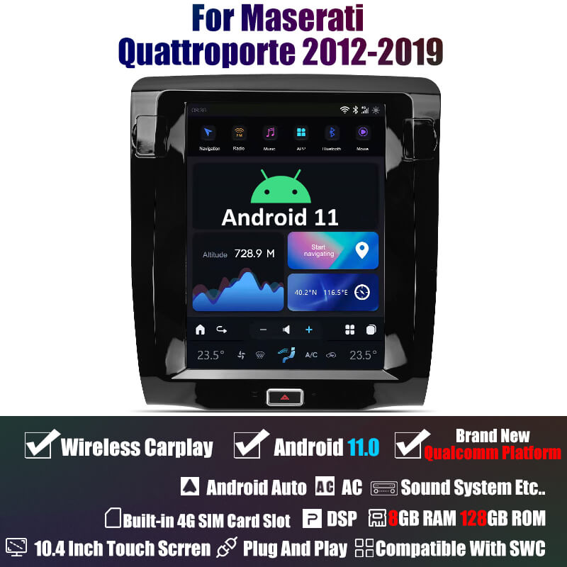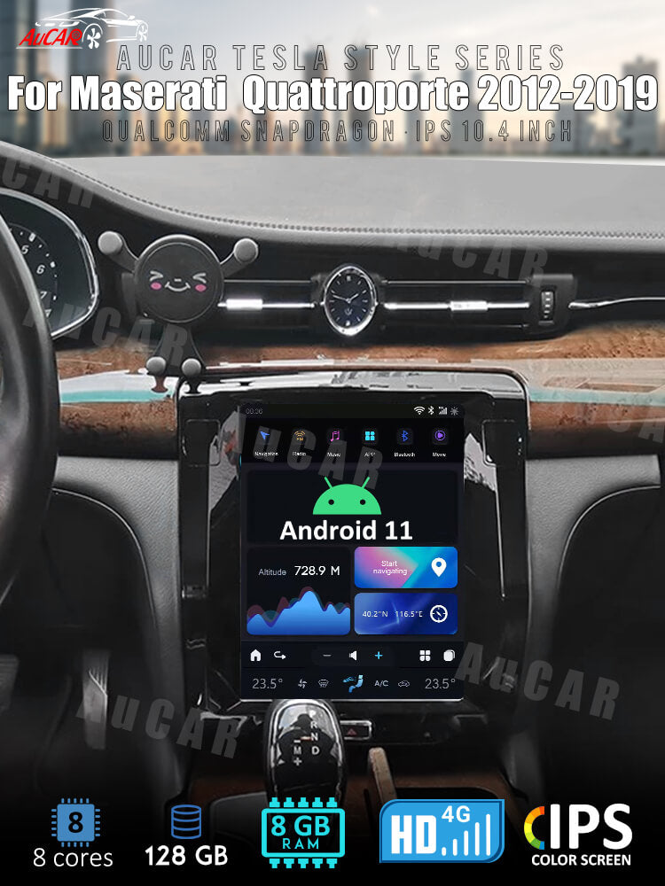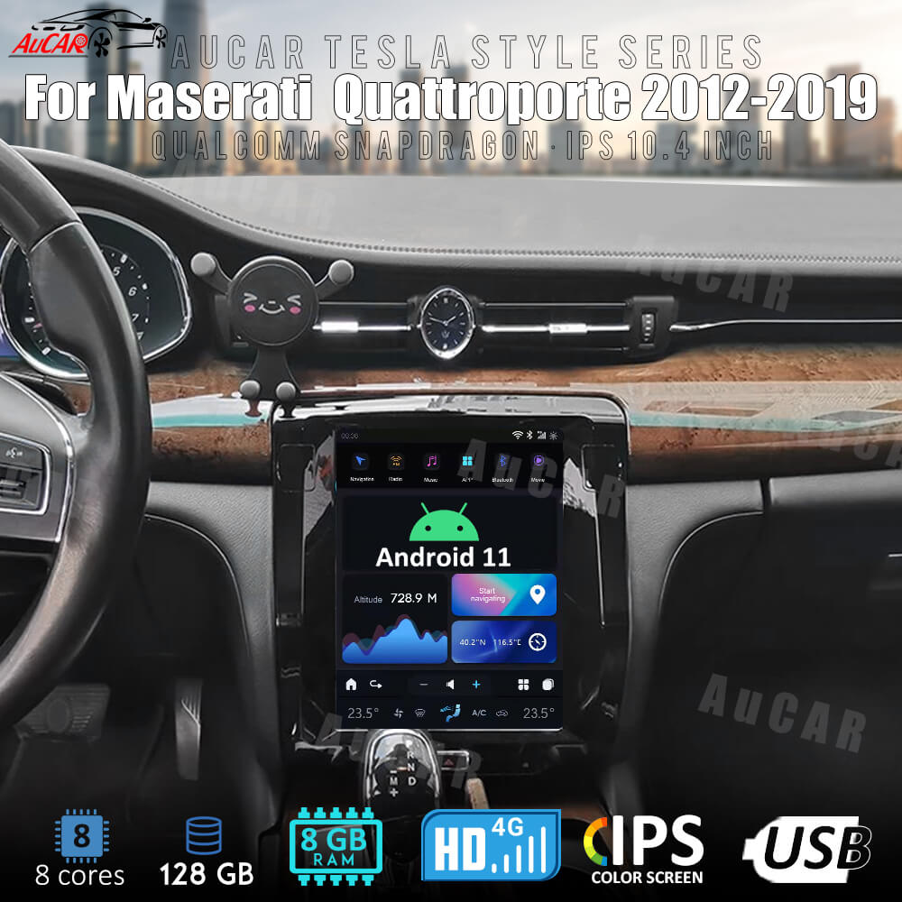 Update your infotainment system with a 10.4" T-style AuCar Maserati head unit with Android 13 8gb ram 128gb rom and wireless Apple Carplay and Android Auto with climate control. Plug and play installation (no splicing wires or soldering!) and retains all factory functions. Includes installation instructions manual. Fits Quattroporte 2012-2019 (both LHD and RHD).
