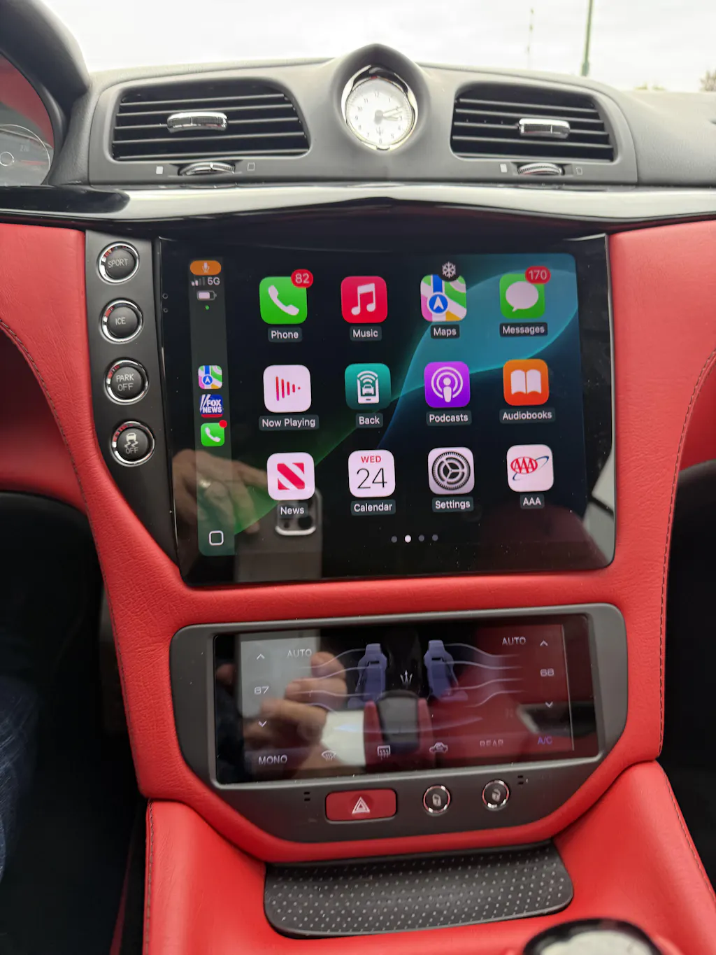 Update your infotainment system with this 10" Gen 5 Maserati head unit with 8gb ram 128gb rom and wireless Apple Carplay and Andriod Auto. Plug and play installation (no splicing wires or soldering!) and retains all factory functions. This model includes chrome ring/surround for the Sport/Ice/Parking/Traction Control buttons, providing a factory look unlike other brands that omit the chrome rings. Both silver and black button panels are included so you can choose your preference.
